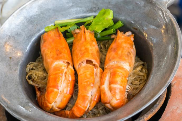 2.ปรุงรสด้วย ผงปรุงรส น้ำตาลทราย ซอสปรุงรส น้ำซุป ใส่วุ้นเส้น กุ้งกุลาดำ คลุกเคล้าให้เข้ากัน