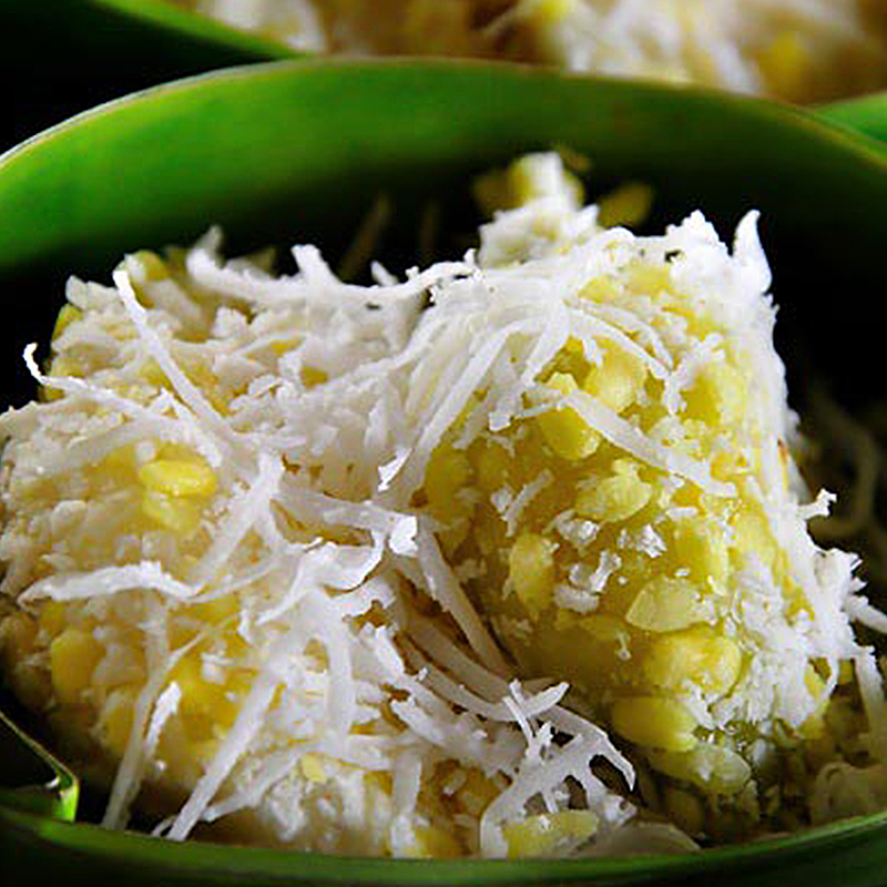 6. คลุกแป้งนึ่งสุกกับส่วนผสมมะพร้าว จัดใส่จาน เสิร์ฟคู่กับส่วนผสมงาและน้ำตาลทราย